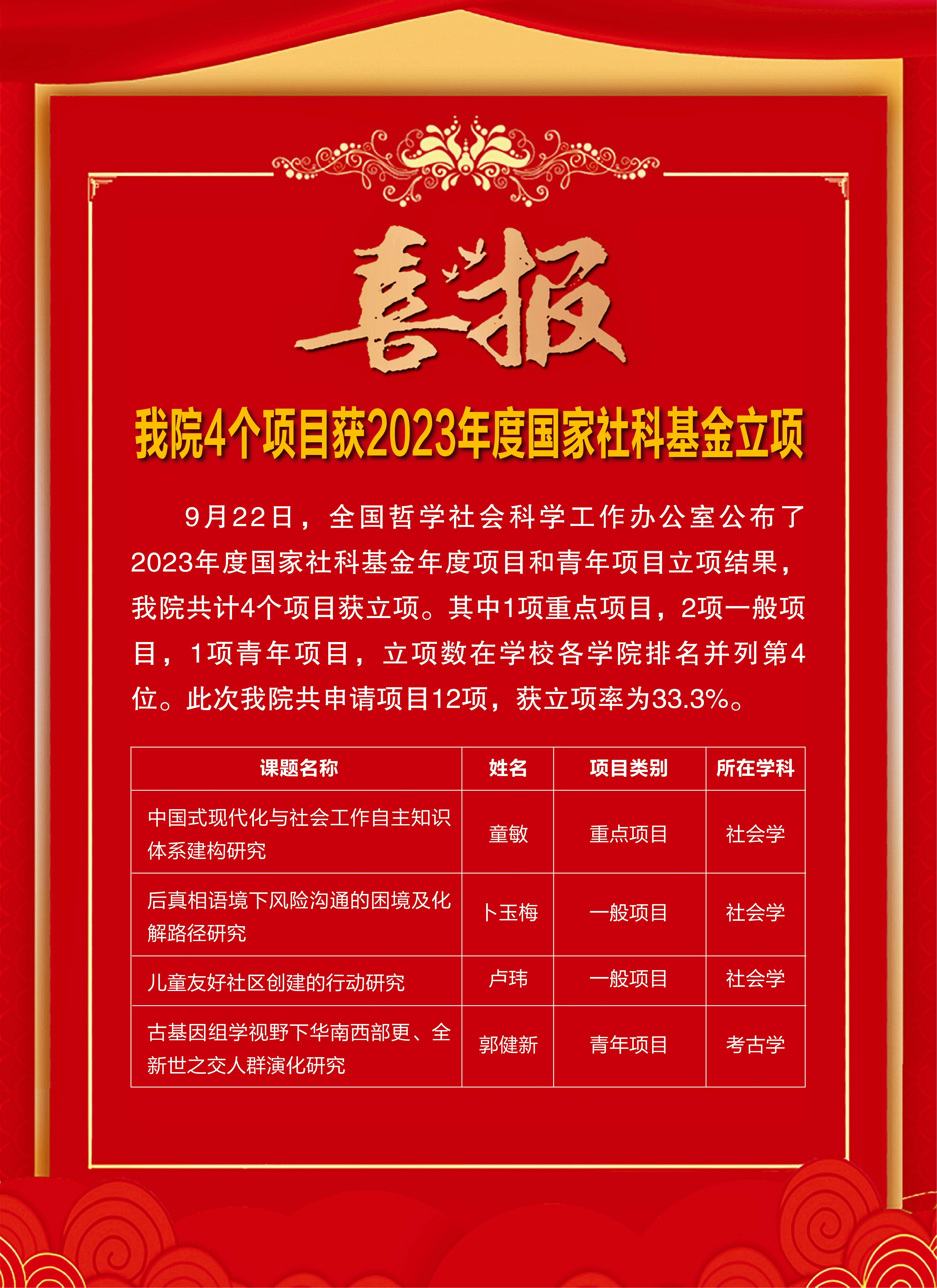 9月22日,全国哲学社会科学工作办公室公布了2023年度国家社科基金年度项目和青年项目立项结果,我院共计4个项目获立项。其中1项重点项目,2项一般项目,1项青年项目,立项数在学校各学院排名并列第4位。此次我院共申请项目12项,获立项率为33.3%。