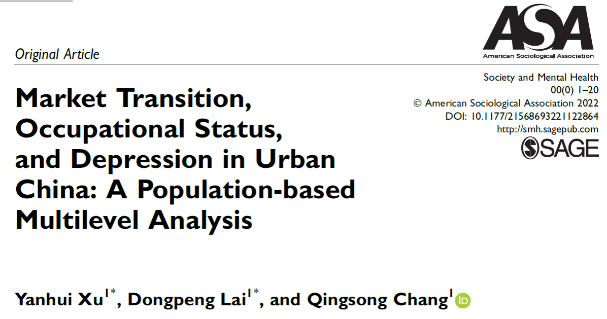 2022年9月12日,社会与人类学院副院长、博士生导师徐延辉教授(第一作者),社会学系2021级博士生赖东鹏同学(共同一作)和厦门大学南强青年拔尖人才、博士生导师常青松副教授(通讯作者)合作完成的研究成果《Market Transition, Occupational Status, and Depression in Urban China: A Population-based Multilevel Analysis》在美国社会学学会(The American Sociological Association, ASA)精神健康社会学国际权威期刊《Society and Mental Health》正式发表。该研究是徐延辉教授担任首席专家的国家社会科学基金重大项目 “新中国70年社会发展与社会变迁研究”(19ZDA141)的阶段性成果。