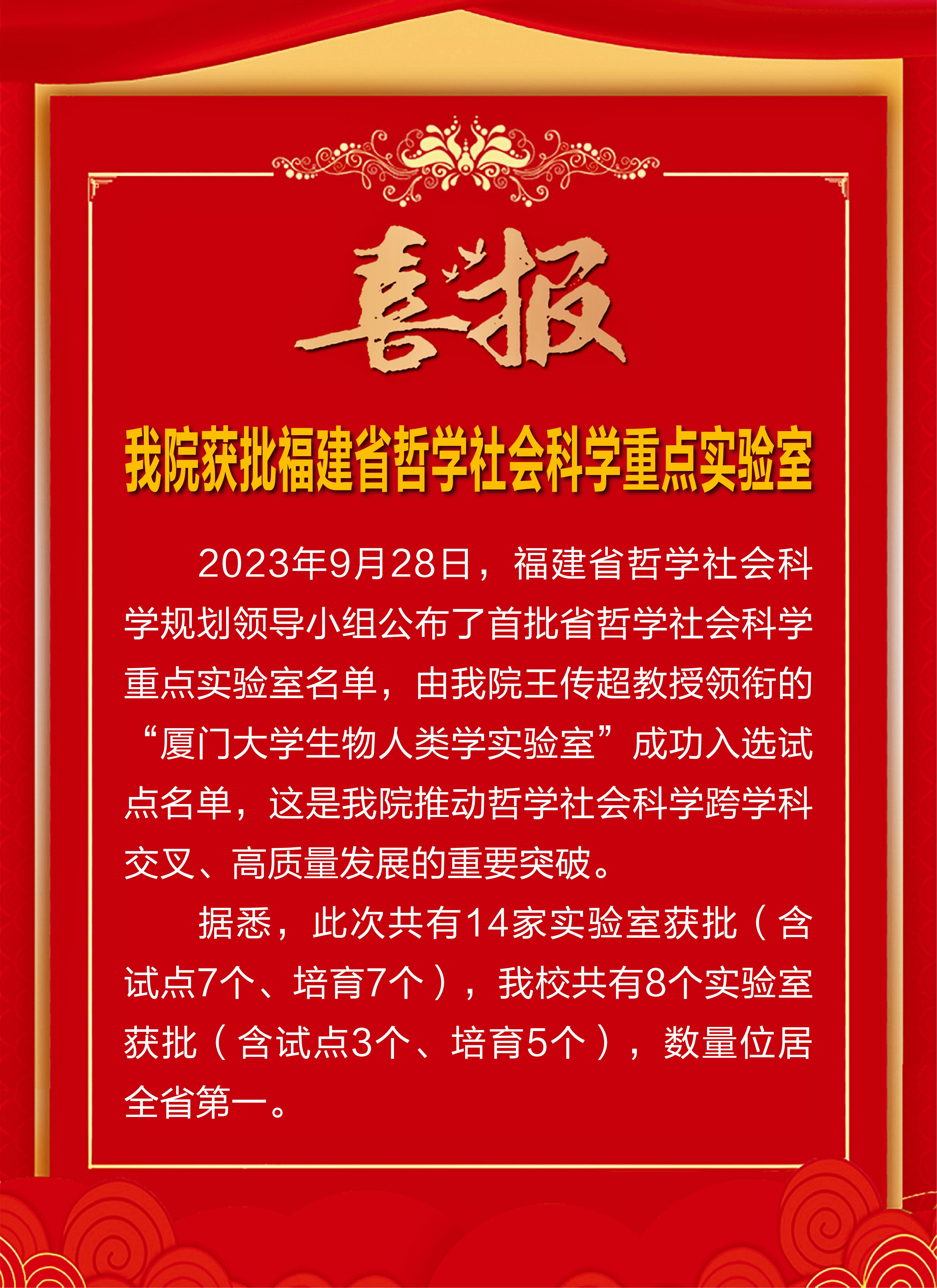 2023年9月28日,福建省哲学社会科学规划领导小组公布了首批省哲学社会科学重点实验室名单,由我院王传超教授领衔的“厦门大学生物人类学实验室”成功入选试点名单,这是我院推动哲学社会科学跨学科交叉、高质量发展的重要突破。