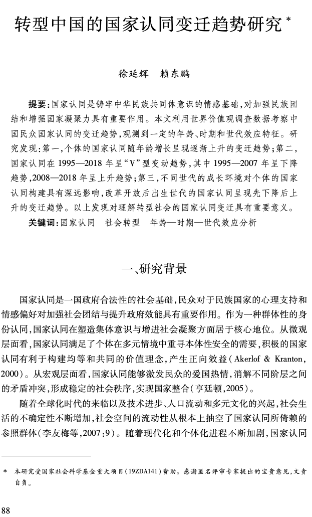 国家认同是铸牢中华民族共同体意识的情感基础,对加强民族团结和增强国家凝聚力具有重要作用。文章利用世界价值观调查数据考察中国民众的国家认同的变迁趋势,观测到一定的年龄、时期和世代效应特征。研究发现:第一,个体的国家认同随年龄增长呈现逐渐上升的变迁趋势;第二,国家认同在1995-2018年间呈“V”型变动趋势,其中1995-2007年呈下降趋势,2008-2018年呈上升趋势;第三,不同世代的成长环境对个体的国家认同构建具有深远影响,改革开放后出生世代的国家认同呈现先下降后上升的变迁趋势。以上发现对于理解转型社会的国家认同变迁具有重要意义。