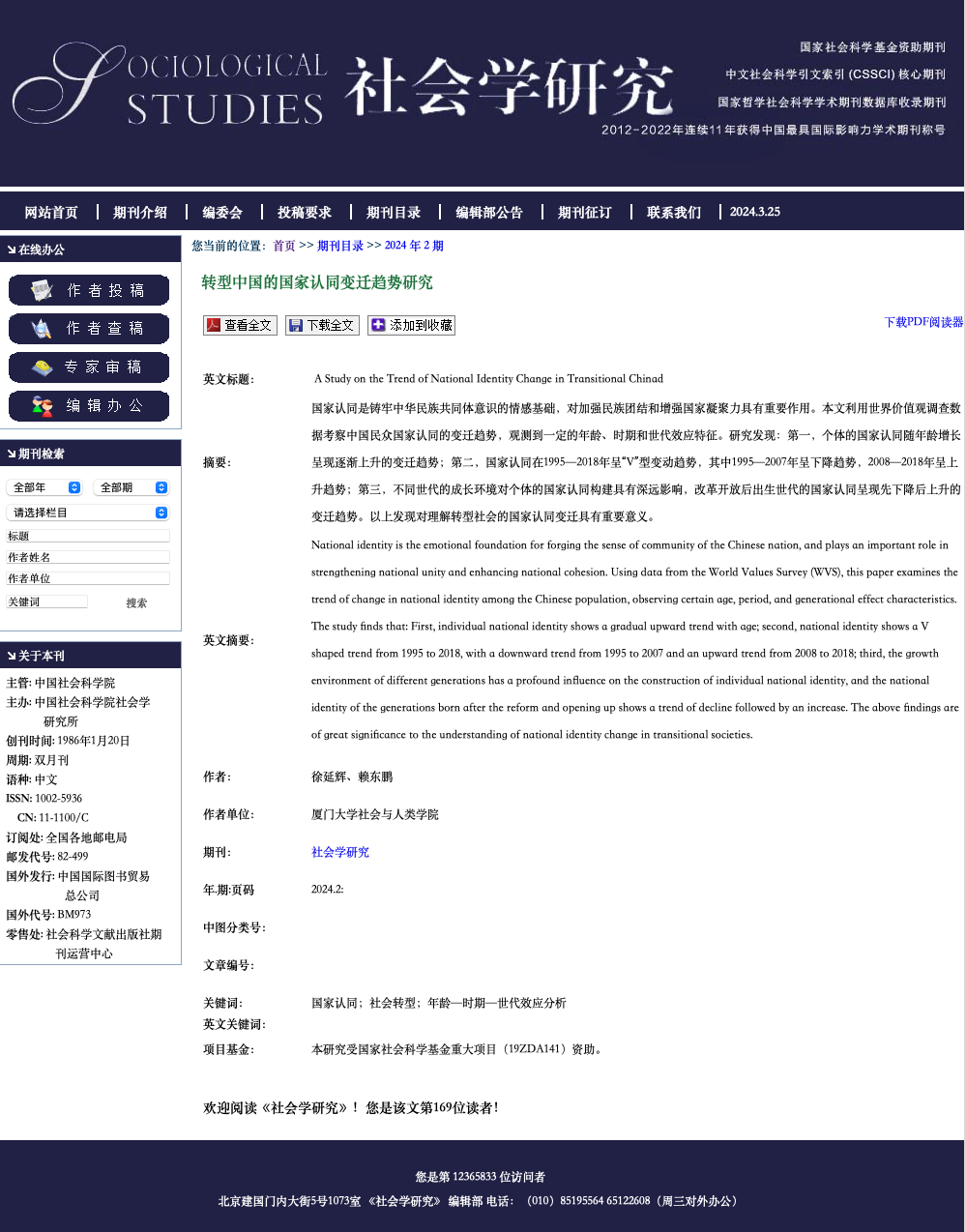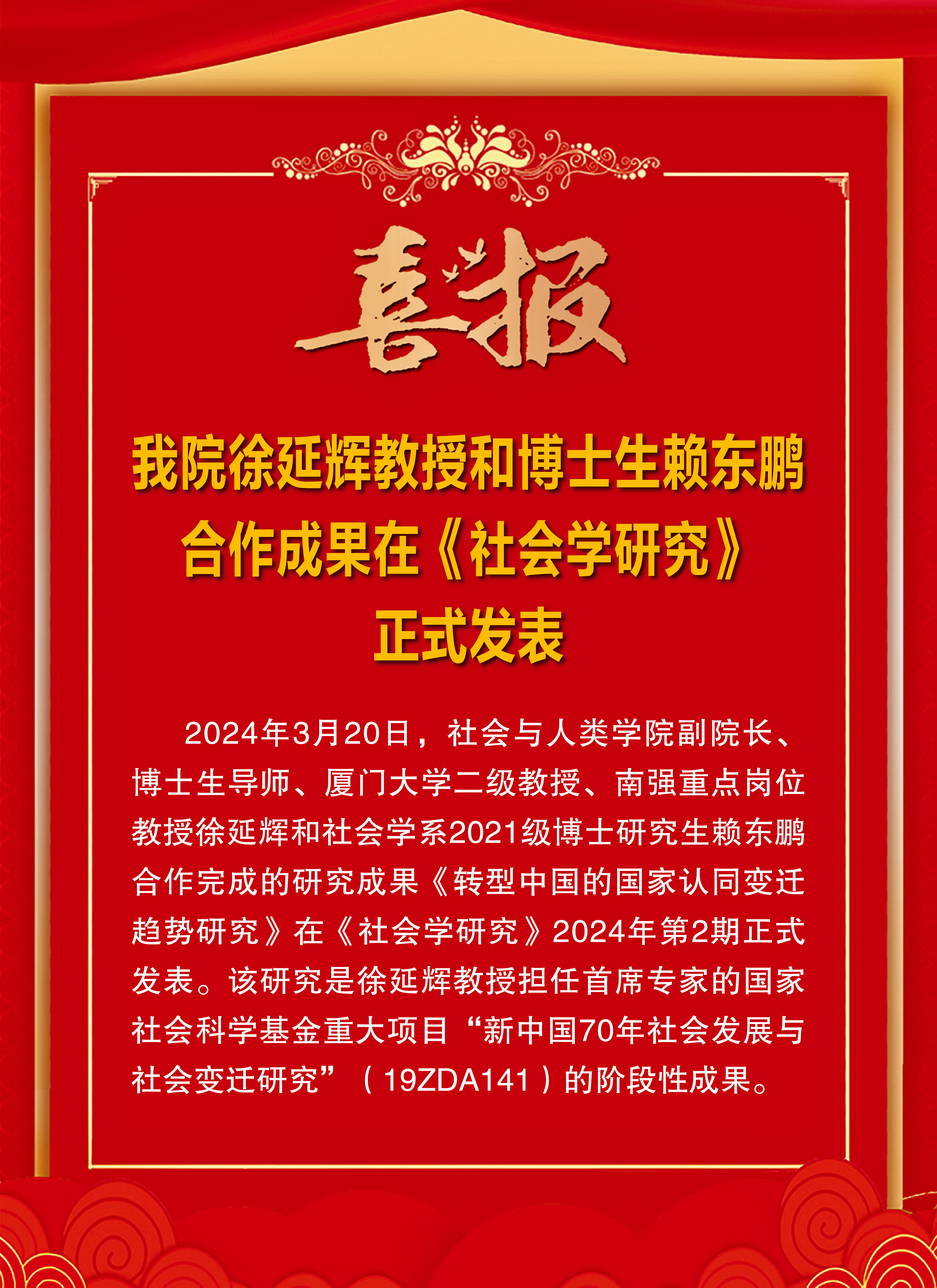 2024年3月20日,社会与人类学院副院长、博士生导师、厦门大学二级教授、南强重点岗位教授徐延辉和社会学系2021级博士研究生赖东鹏合作完成的研究成果《转型中国的国家认同变迁趋势研究》在《社会学研究》2024年第2期正式发表。该研究是徐延辉教授担任首席专家的国家社会科学基金重大项目“新中国70年社会发展与社会变迁研究”(19ZDA141)的阶段性成果。
