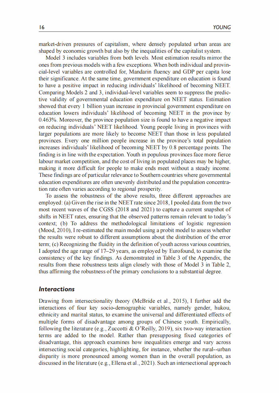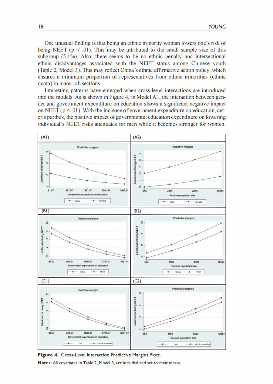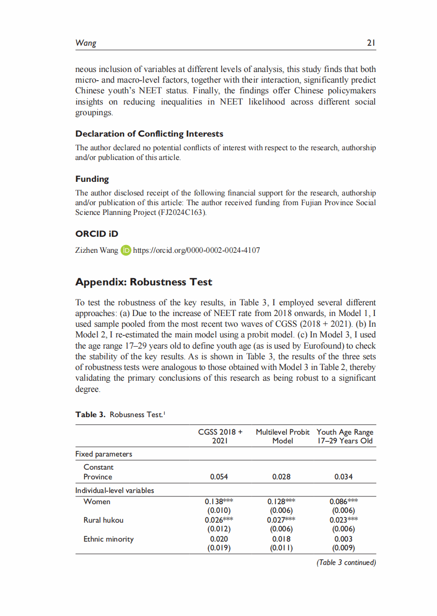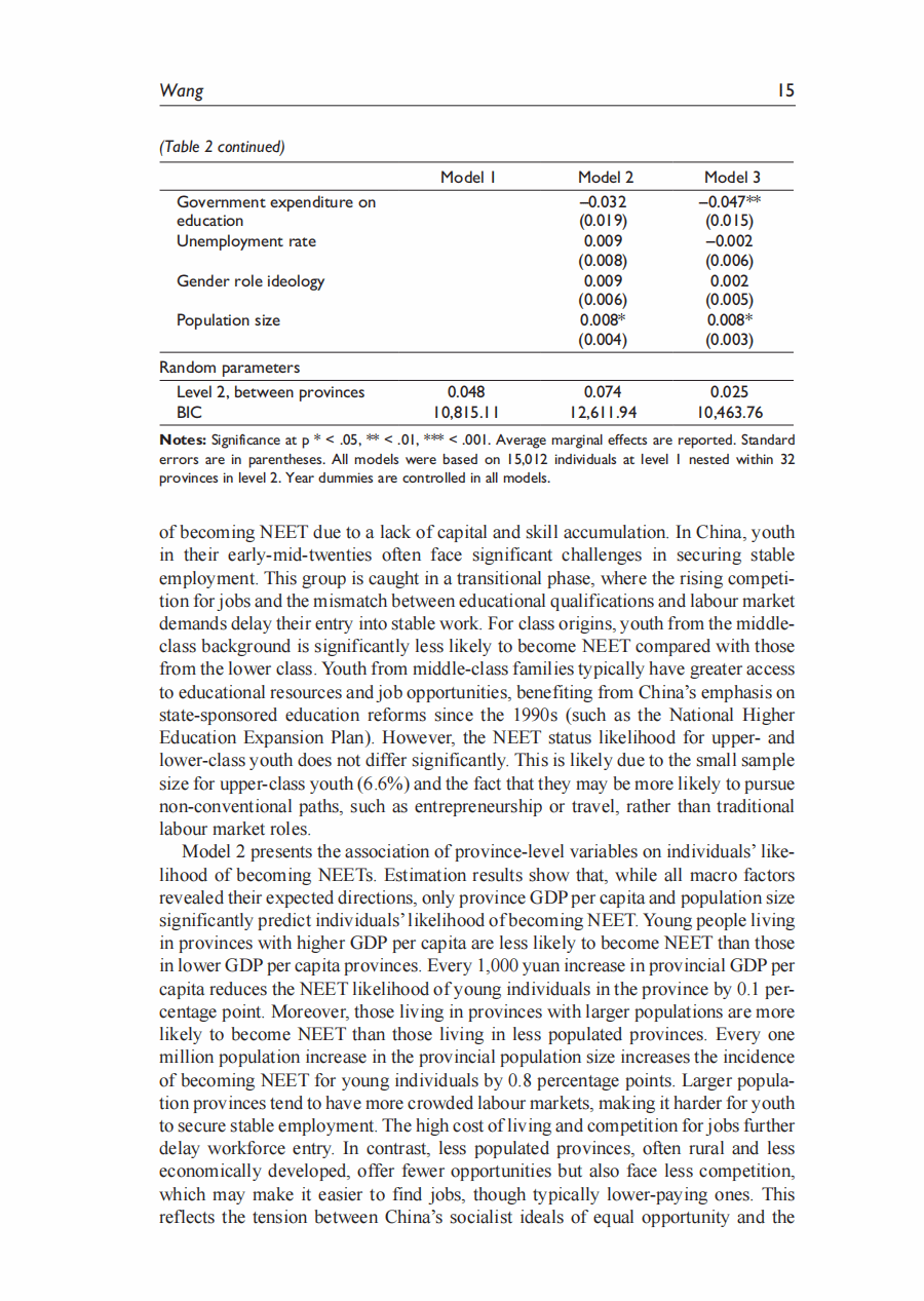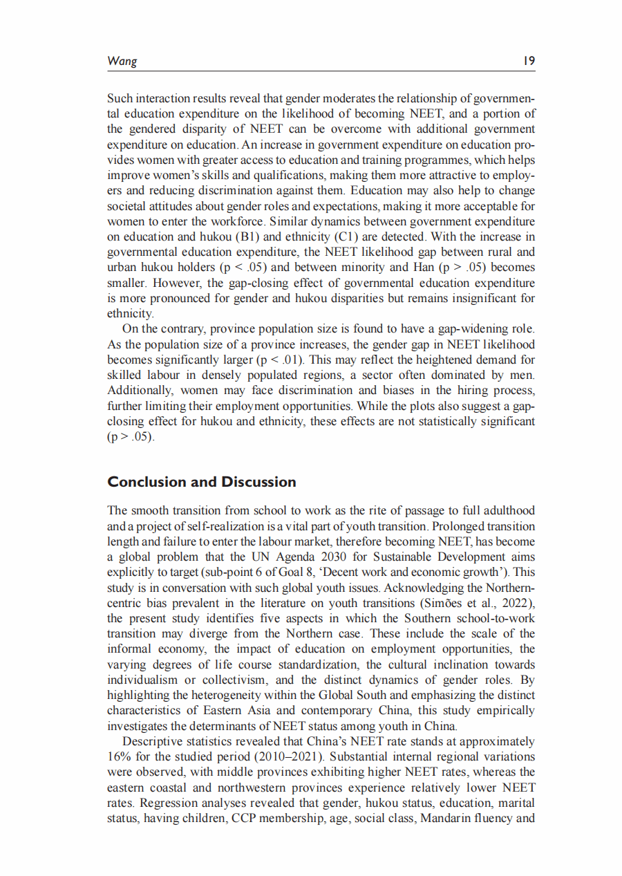摘要:本研究关注中国的尼特族群体(Not in Employement Education or Training),并分析青年成为尼特族的个人和结构性决定因素。根据中国综合社会调查(2010-2021)的六次数据,通过多层模型分析发现: (1) 中国的尼特族比率为16%,并存在显著的内部地区差异。(2) 教育能够降低成为尼特族的发生率的常识受到质疑。分析显示,只有获得高等教育学位才能降低成为尼特族的可能性。(3) 交叉性分析发现,女性子群体之间有成为尼特族的不同可能性,例如已婚女性与未婚女性、农村女性与城市女性之间的差异,比不同性别或户籍之间的差异更大。(4) 跨层交互分析发现,省级政府的教育支出可以缩小不同性别和户籍之间的尼特族可能性差异,而较大的省级人口则加剧了性别差距。本研究对降低中国尼特族率,提高青年就业率有重要政策指导意义。