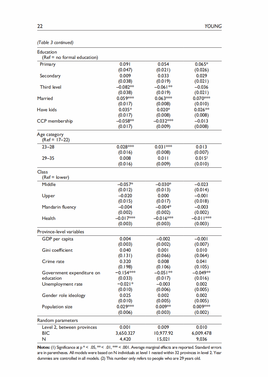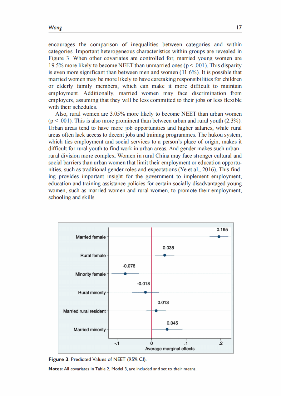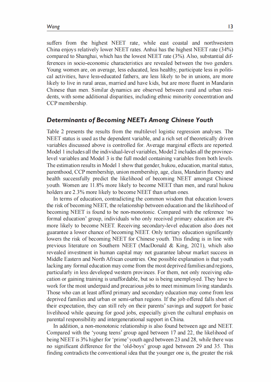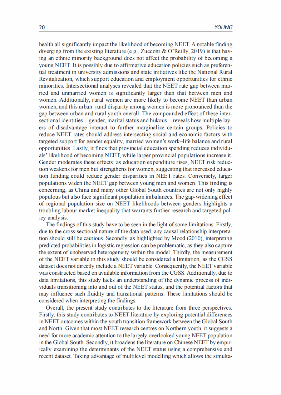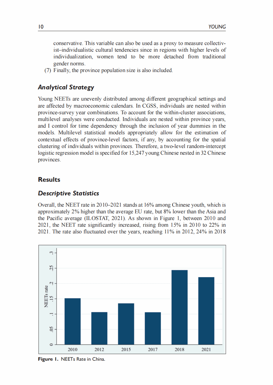 摘要:本研究关注中国的尼特族群体(Not in Employement Education or Training),并分析青年成为尼特族的个人和结构性决定因素。根据中国综合社会调查(2010-2021)的六次数据,通过多层模型分析发现: (1) 中国的尼特族比率为16%,并存在显著的内部地区差异。(2) 教育能够降低成为尼特族的发生率的常识受到质疑。分析显示,只有获得高等教育学位才能降低成为尼特族的可能性。(3) 交叉性分析发现,女性子群体之间有成为尼特族的不同可能性,例如已婚女性与未婚女性、农村女性与城市女性之间的差异,比不同性别或户籍之间的差异更大。(4) 跨层交互分析发现,省级政府的教育支出可以缩小不同性别和户籍之间的尼特族可能性差异,而较大的省级人口则加剧了性别差距。本研究对降低中国尼特族率,提高青年就业率有重要政策指导意义。