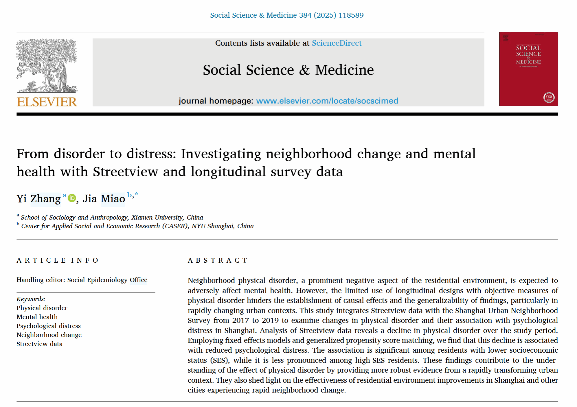 2025年9月15日,我院社会学系助理教授张奕与上海纽约大学应用社会经济研究中心助理教授缪佳合作完成的研究成果“From disorder to distress: Investigating neighborhood change and mental health with Streetview and longitudinal survey data(从失序到精神压力:利用街景与追踪调查数据研究社区变迁与心理健康)”正式发表于社会医学领域国际权威期刊 《Social Science & Medicine》。