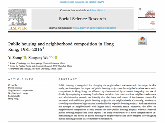 2025年10月25日,我院社会学系助理教授张奕与上海纽约大学应用社会经济研究中心主任、讲席教授吴晓刚合作完成的研究成果“Public housing and neighborhood composition in Hong Kong, 1981–2016(《香港地区的公屋与社区构成:1981-2016》)”正式发表于社会学国际权威期刊 《Social Science Research》。