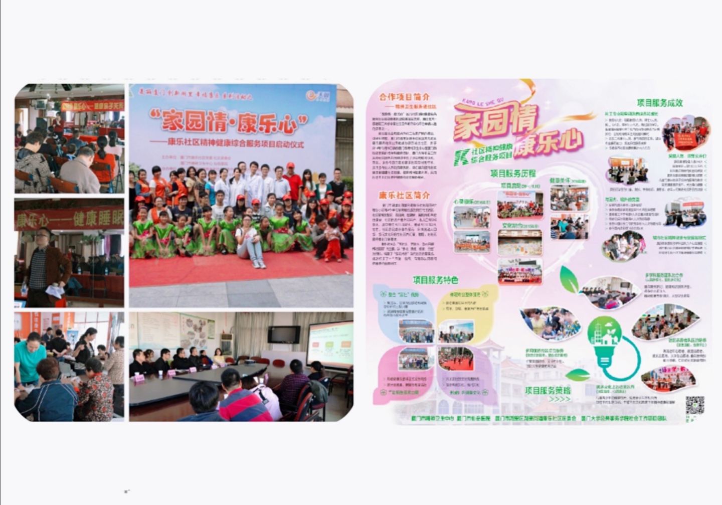 2013年,在厦门市卫计委的大力支持下,我院社会工作系和厦门市仙岳医院、厦门市湖里区康乐社区共同合作开展了《城市社区精神健康综合服务》项目,2015年至2017年社工参与精神障碍患者院内康复服务的探索作为厦门市国家精神卫生综合管理试点城市工作的一个创新点,得到国家卫计委检查组对我市试点工作检查考评的肯定,并荣获了第五届林护杰出社会工作服务项目奖。