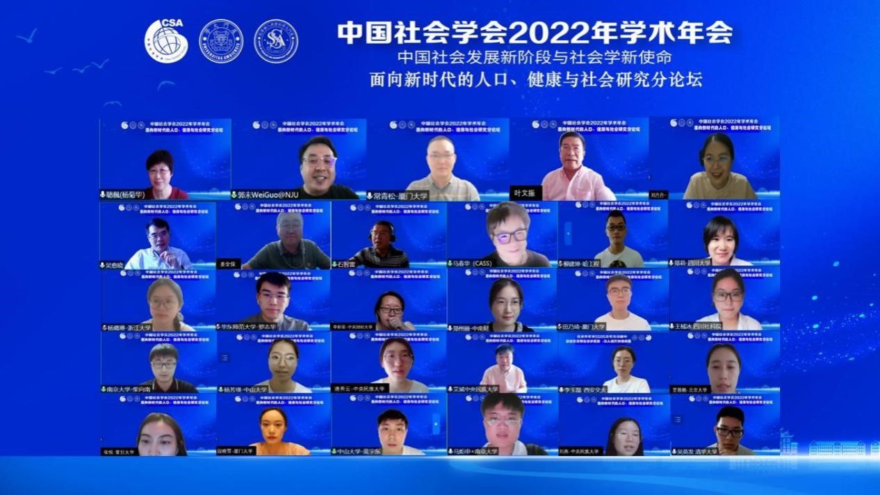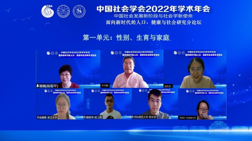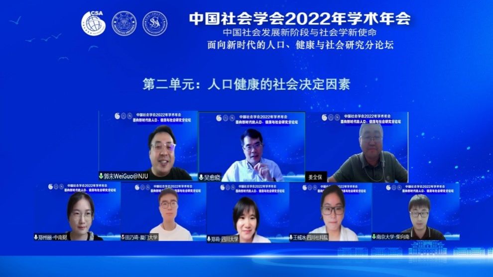 2022年8月27日,由厦门大学社会与人类学院、中央民族大学民族学与社会学学院、南京大学社会学院共同主办的中国社会学会2022年学术年会“面向新时代的人口、健康与社会研究”分论坛通过线上会议的方式成功召开。来自中央民族大学、南京大学、厦门大学、清华大学、北京大学、中国社会科学院、复旦大学、浙江大学、华中科技大学、四川大学、西安交通大学、哈尔滨工程大学等高校和研究机构的诸多师生同仁参加了本次会议。本次分论坛由来自于中央民族大学民族学与社会学学院的杨菊华教授、南京大学社会学院的郭未教授和厦门大学社会与人类学院的常青松副教授共同担任论坛召集人。论坛共分为“性别、生育与家庭”、“人口健康的社会决定因素”、“老龄化与健康福祉”和“研究生论坛”四个单元,各位专家学者对面向新时代的人口、健康与社会问题进行了全面、精彩的探讨和交流。