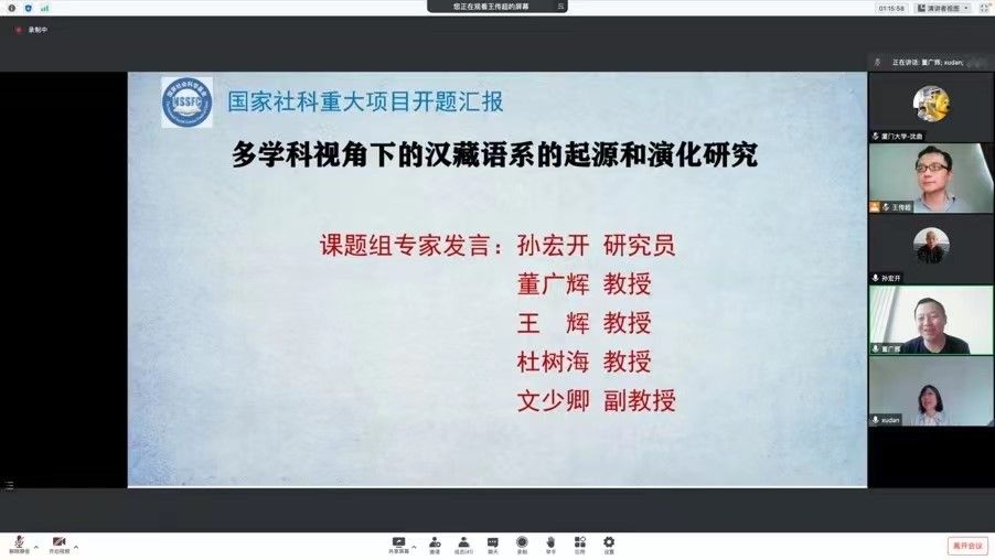 2022年7月28日,由厦门大学社会与人类学院王传超教授担任首席专家的2021年度国家社会科学基金重大招标项目“多学科视角下的汉藏语系的起源和演化研究”开题论证会在线上召开。厦门大学党委宣传部部长、社科处处长高和荣教授在会上致辞,社会与人类学院副院长冯文晖主持会议。项目组成员到会并汇报了该项目的缘起、总体框架、研究内容与方案等。来自中国人民大学、浙江大学、复旦大学、西藏民族大学、德国美因茨大学,以及厦门大学语言学、考古学、民族学、生物人类学等多学科领域的专家学者,对该项目的设计与后期调研计划做了认真、全面的评估,给予了充分肯定,并提出一系列重要的学术意见与建议。