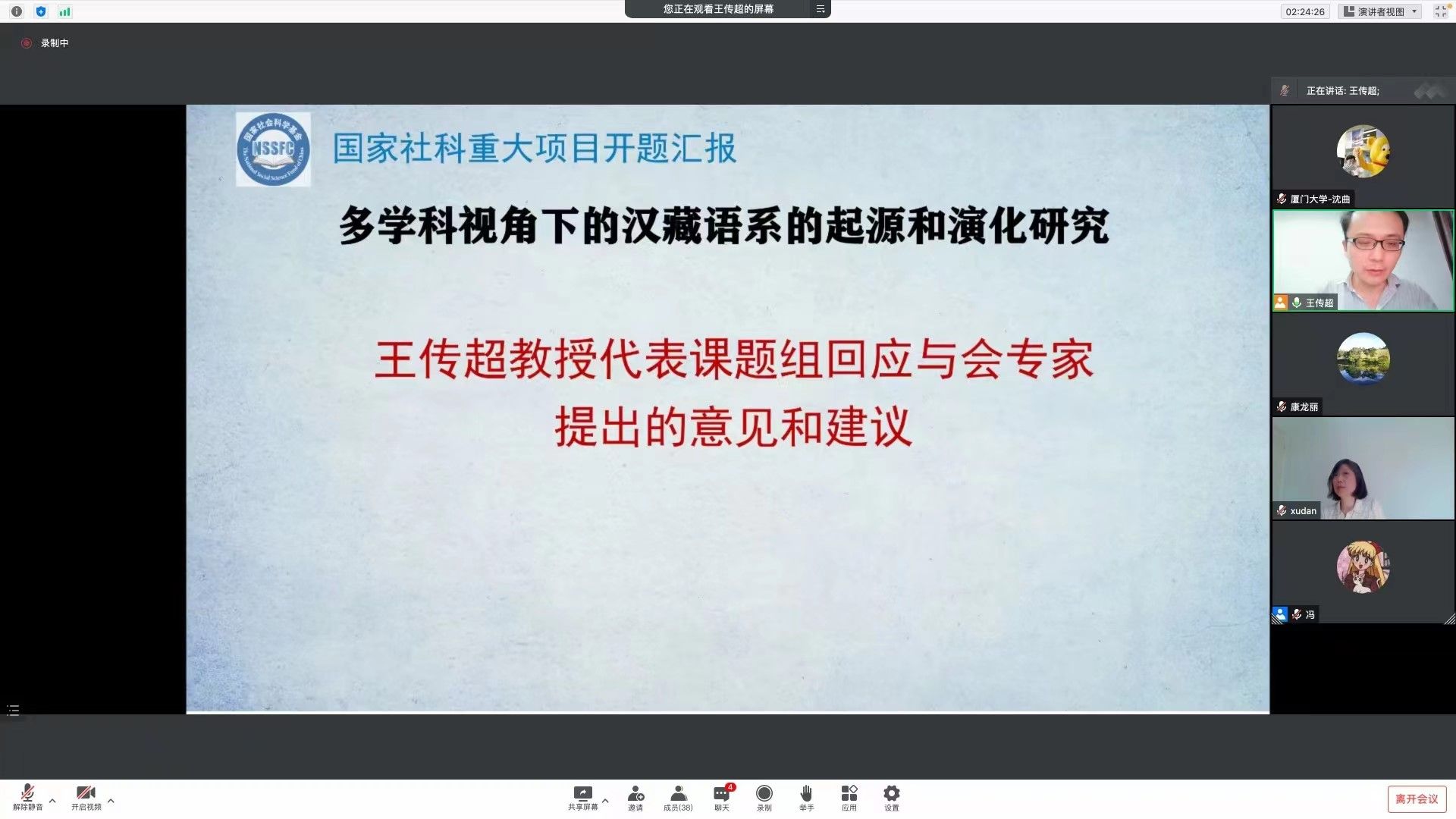 最后,王传超教授代表课题组衷心感谢与会专家提出的意见和建议,对专家组提出的问题进行了总结回应,并表示在未来研究中,将进一步加强与各个项目团队的深入合作、开拓进取、继续推进课题组产出高质量的研究成果,为汉藏语系的起源和演化提供更加全面详实的证据,为铸牢中华民族共同体意识,推动中华民族成为认同度更高、凝聚力更强的命运共同体,构建起维护国家统一和民族团结的坚固思想长城作出贡献。