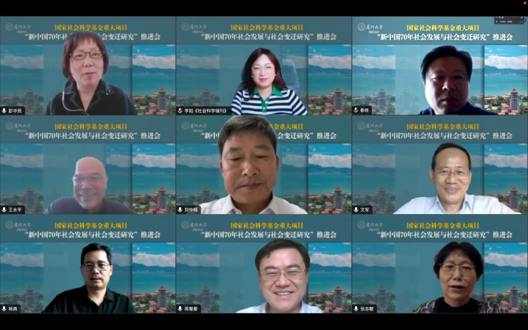 2023年9月2日,由厦门大学社会与人类学院徐延辉教授担任首席专家的国家社科基金重大项目“新中国70年社会发展与社会变迁研究”通过视频会议的形式举行了推进会。推进会专家组由南京大学社会建设与社会工作研究院院长彭华民教授、华东师范大学社会发展学院院长文军教授、上海大学社会学院院长黄晓春教授,中国社会科学院社会学研究所副所长杨典研究员、《社会学研究》编辑部副主任张志敏副编审、《新华文摘》杂志社副社长刘仲翔编审、中国管理科学学会学术委员会副秘书长周蜀秦教授、《社会科学战线》副主编王永平研究员和《社会科学辑刊》副主编李阳研究员组成,项目子课题负责人、课题组成员共20余人参加了会议。